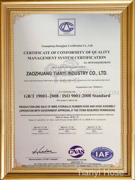 Zaozhuang Tianyi Industry Co., Ltd., founded in 2002, owns about 200 staffs and covers an area of 30,000 square meters. In 2014, the company built a new plant covering 5000 square meters to hold the imported advanced high-tech equipments for improving its technology capacity and productivity.At present, the company is mainly engaged in the design, development, production and sales of high pressure wire braided hose, high pressure wire spiraled hose, high pressure petroleum hose, water hose, ultra high pressure twined hose, high-temperature resistant hose, air hose, cotton hose, hydraulic hose, smooth hose, plastic-coated hose, automobile brake hose, stainless steel hose and assembly, which are featured as heat resistance ( 220°C), cold tolerance (-60°C), high pressure resistance, oil proof as well as acid and alkali erosion endurance. All of over 60 types of products in 900 sizes manufactured by the company are awarded ISO9001 certificate,which have been widely used in industries such as oil, chemical, metallurgical, coal, mining, shipping,hydroelectric as well as machinery.The company has won the High-tech Enterprise Certificate issued by Science and Technology Committee of Shandong Province and was selected as the Municipal Enterprise Technology Center by Zaozhuang Municipal Commission of Economy and Information Technology. Inspired by the technology-oriented idea, the company tries its best to build the comprehensive scientific and technological development institution and jointly established the R&D platform with Qingdao Science & Technology University to enhance the research, development and innovation of products. Adhering to the operation philosophy of “people-oriented and create the classic”, the company has been developing and manufacturing high-quality products through advanced technology and precise inspection. The increasing research of new tech and materials as well as the tireless effort to improve the quality and productivity make the company quite famous among domestic counterparts, the products are popular in domestic market and have been exported to the US, Russia, Turkey, Iran, Dubai, Portugal, South Korea, Brazil and South Africa, etc. The company has established sincere friendship with its overseas partners during the years of cooperation.